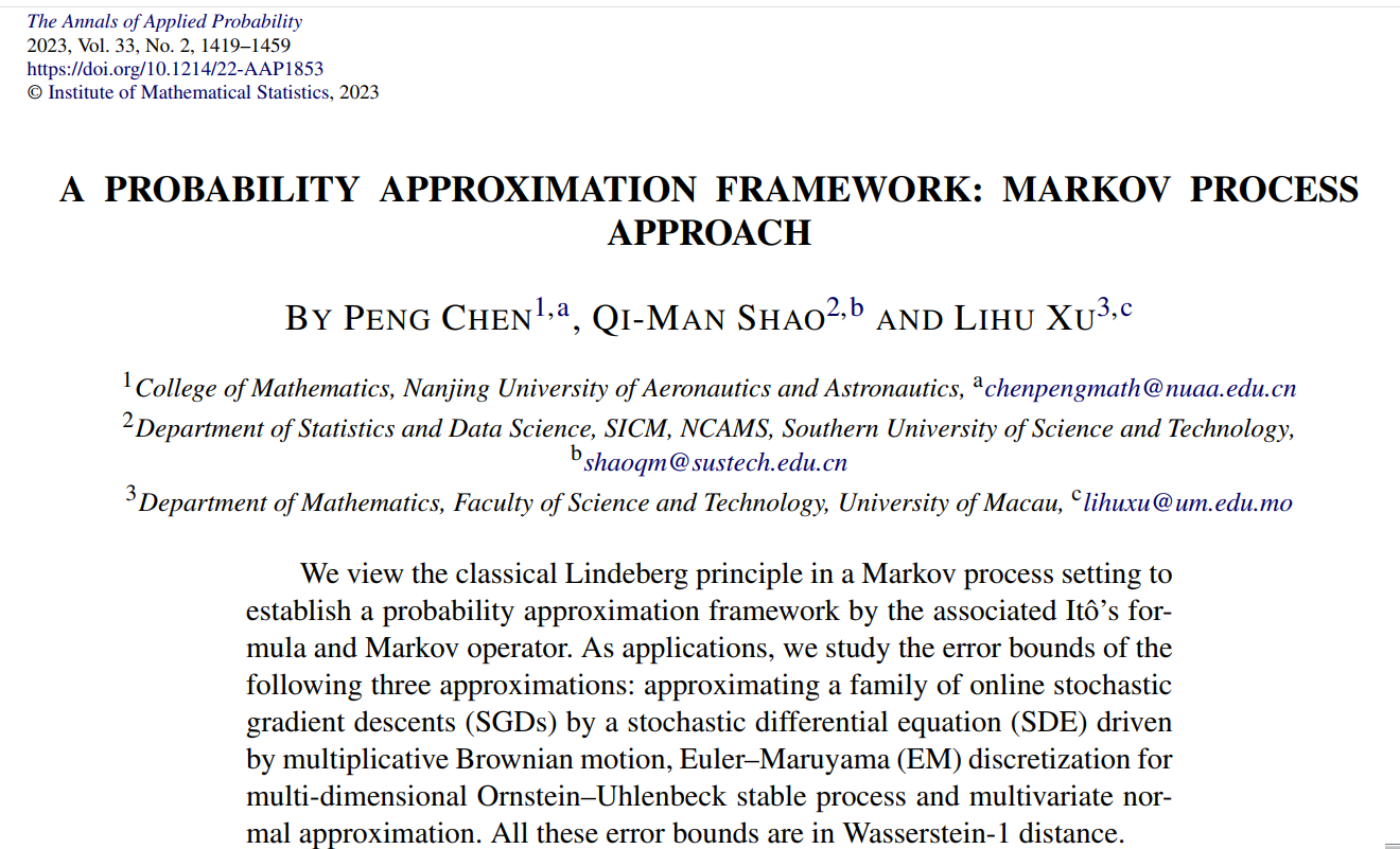 日前,贝博概率统计系教师陈鹏及其合作者在概率统计顶级期刊《The Annals of Applied Probability》上发表了题为“A Probability Approximation Framework: Markov Process Approach”的研究论文。