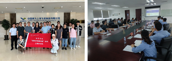 在上海飞机制造有限公司,工装中心副主任叶晓云、人力资源部副部长候佩领陪同师生们参观了“永不放弃”雕塑广场、数控智能工厂、ARJ21总装生产线、C919总装生产线等。商飞人永不放弃的精神、大国工匠风采让师生们深为感动。在座谈环节,师生与来自各部门的校友代表进行了深入交流。侯佩领介绍了公司发展情况及人才政策。校友们介绍了在上飞公司的发展情况、所在部门人才、项目需求情况等。许静表示,上飞公司是南航人事业发展的热土,非常高兴看到校友们在上飞公司的良好发展,希望以校友为桥梁,进一步密切上飞公司和南航的联系。王春武详细介绍了学院与飞机制造关联度较高的科研团队及研究内容,就校企科研、育人合作进行了交流。