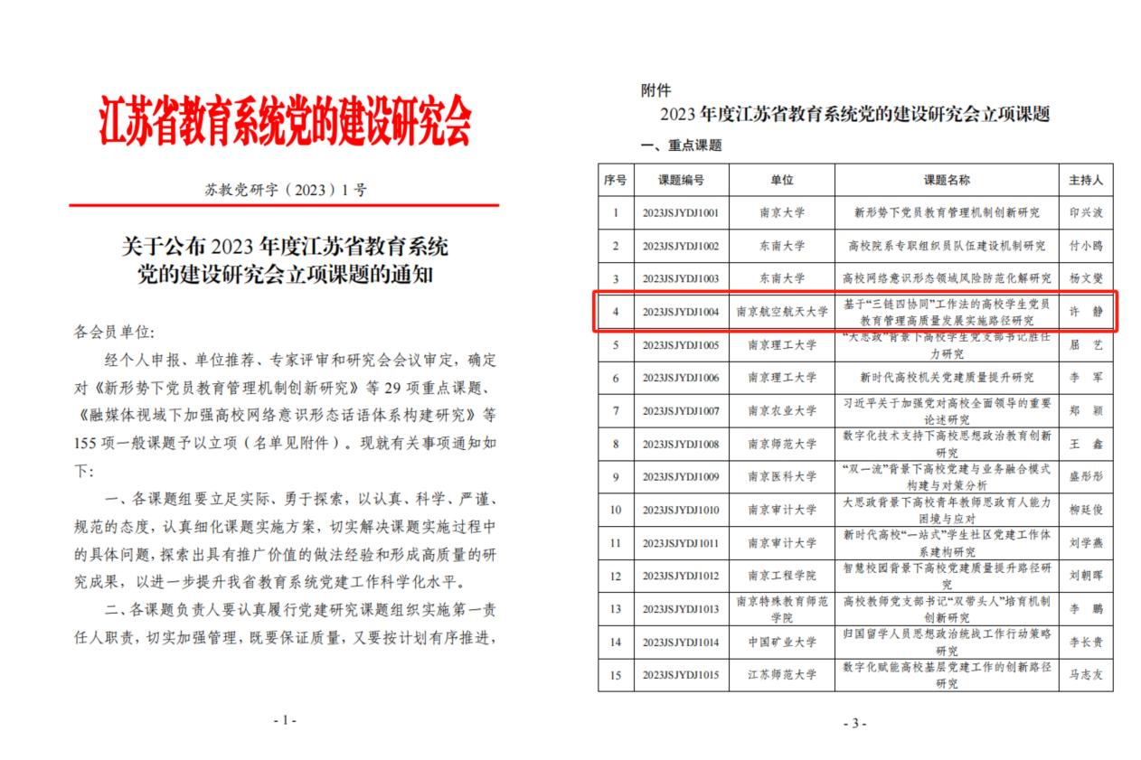近日,江苏省教育系统党的建设研究会发布了《关于公布 2023 年度江苏省教育系统党的建设研究会立项课题的通知》,经个人申报、单位推荐、专家评审和研究会会议审定,贝博申报的《基于“三链四协同”工作法的高校学生党员教育管理高质量发展实施路径研究》获重点课题立项(29项)。