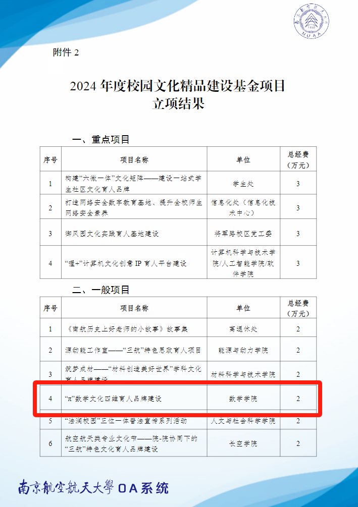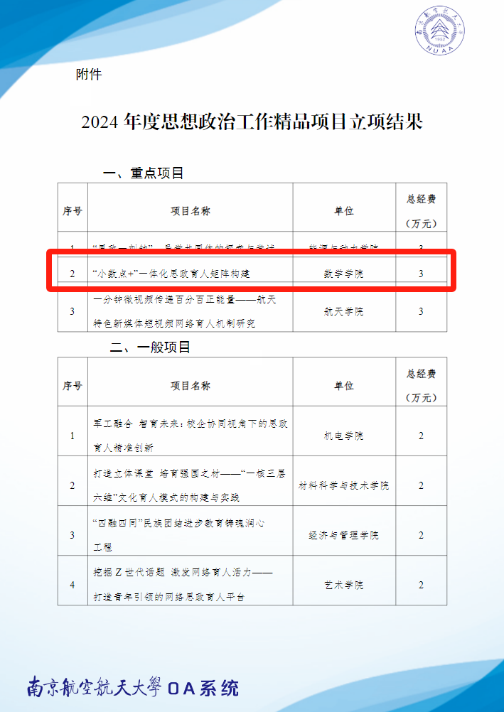 近日,我校党委宣传部发布了《关于公布2022年度校园文化精品建设基金项目验收和2024年度校园文化精品建设基金项目立项结果的通知》《关于公布2024年度思想政治工作精品项目立项结果的通知》,经过自主申报、单位推荐、专家评审、立项公示等环节,贝博2022年度校园文化精品建设基金项目《“同心筑梦”中华民族共同体教育校园文化情境建设》通过验收,贝博申报的《“π”数学文化四维育人品牌建设》获2024年度校园文化精品建设基金项目一般立项,贝博申报的《“小数点+”一体化思政育人矩阵构建》获2024年度思想政治工作精品项目重点立项。