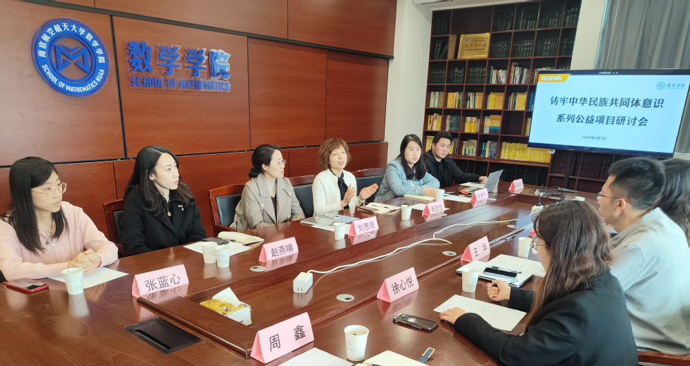 4月7日上午,“铸牢中华民族共同体意识”系列公益项目研讨会在理学楼302会议室召开。江苏省妇儿基金会副理事长王华、江苏省同读好书共芸窗研究院资助部部长黄玺澄,BB贝博艾弗森官网党委副书记周佼佼、辅导员张鹤千,人文与社会科学学院党委副书记刘思辰、团委书记赵燕喃及南航公益创业代表徐心悦、张芳菲、周鑫、张蓝心、郭启凡等共同参加研讨。