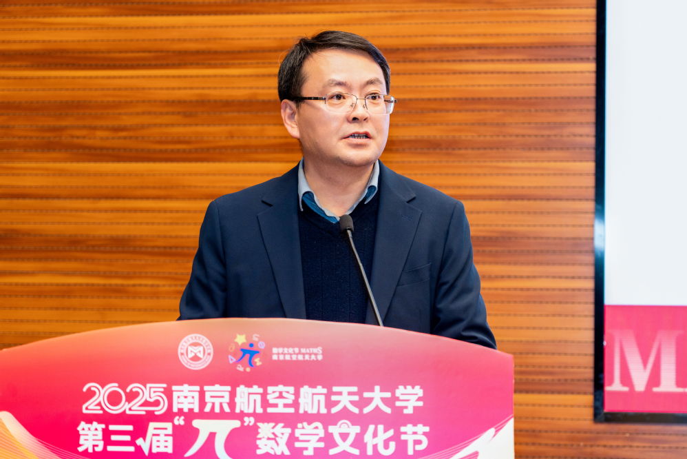 院长王春武对与会嘉宾表示热烈欢迎。作为学院丰富学科内涵、推动高质量发展的重要载体之一,“π”数学文化节系统展示了学院在人才培养体系构建、科研攻关突破等方面取得的阶段性成果,强调了数学在飞行器精准导航、5G通信等领域中的重要作用,希望广大师生胸怀航空报国使命担当,为实现高水平科技自立自强贡献数学力量。