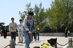 在庄严肃穆的烈士纪念碑前,师生党员手持鲜花,依次缓步上前,将鲜花摆放在纪念碑基座旁,深深鞠躬、肃立默哀,以朴素而庄重的仪式表达对革命先烈的崇高敬意。
