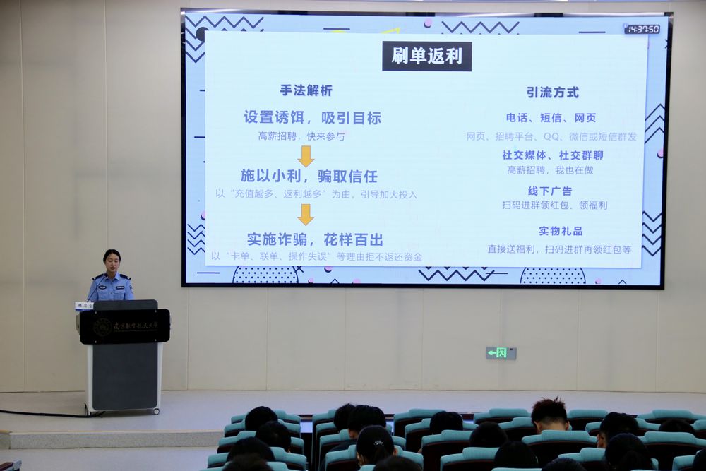 为进一步增强全体师生的安全防范意识,提高反诈骗能力,9月26日,BB贝博艾弗森官网在天目湖校区牧星楼T2108报告厅举办防电诈安全教育专题讲座。本次讲座特邀溧阳市古县派出所滕若兮警官以防范诈骗为主题,为师生讲解反诈安全知识。全体2024级本科生、2025级少数民族预科生到场聆听学习。